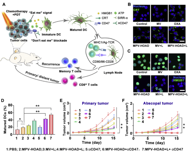 A)奥沙利铂前药脂质体MPV-HOAD并协同CD47阻断抗肿瘤免疫治疗示意图;(B)MPV-HOAD脂质体诱导肿瘤细胞CRT外翻;(C)MPV-HOAD脂质体诱导肿瘤细胞HMGB1外排;(D)MPV-HOAD并协同CD47阻断诱导DC细胞熟化;(E)MPV-HOAD并协同CD47阻断抑制原位瘤的生长;(F)MPV-HOAD并协同CD47阻断抑制远端瘤的生长。