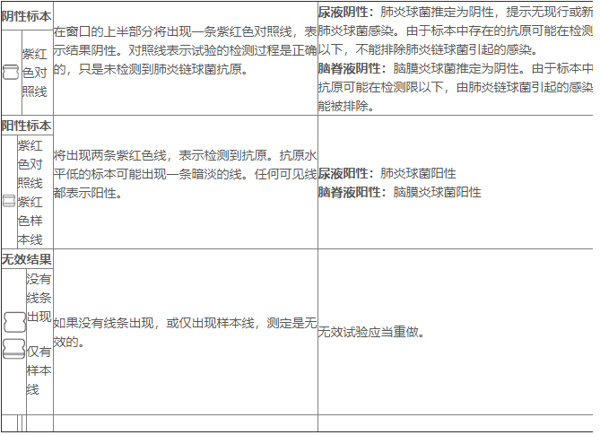 试验结果可通过紫红色线的出现与否来解释。阳性结果(取决于标本中存在的抗原浓度)在15分钟读数时,会检测出样本线和对照线。阴性结果,15分钟读数时只出现对照线,表示标本中未检测到肺炎链球菌抗原。如果对照线未出现,不管标本线出现与否,都视为无效结果。