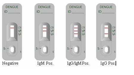 登革热NS1快速检测是基于人血清中NS1抗原检测的免疫试验。试验区纤维膜上包被有NS1特异性抗体,还设置了独立的质控区,以确保试验的有效性。试验中,将样本直接加至样本加样区,然后将其放置在含有3滴缓冲液的贮存孔内,样本与缓冲液混合,然后与胶体金结合的NS1特异性单抗反应,液体在纤维膜上移动(毛细血管作用),与纤维膜上包被的抗NS1抗体反应,如果样本中存在抗原,试验区就会出现红色条带,如果试验操作正确,质控区也会出现红色条带,则表示试验有效。