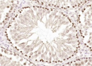 多聚甲醛固定,石蜡包埋(大鼠睾丸);用柠檬酸钠缓冲液(pH6.0)煮沸15min后获得抗原;用3%过氧化氢阻断内源性过氧化物酶20分钟;阻断缓冲液(正常山羊血清)37℃30min;用BRC4多克隆抗体进行抗体孵育Tibody,未结合,1:200,4°C下过夜,然后根据SP试剂盒(兔子)说明和DAB染色进行操作。