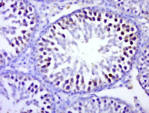 多聚甲醛固定,石蜡包埋(大鼠睾丸);经柠檬酸钠缓冲液(pH6.0)煮沸15min后获得抗原;用3%过氧化氢阻断内源性过氧化物酶20分钟;阻断缓冲液(正常山羊血清)37℃30min;用BTBD1多克隆抗体孵育Tibody,未结合在1:500下在4°C下过夜,然后结合二次20分钟,DAB染色。